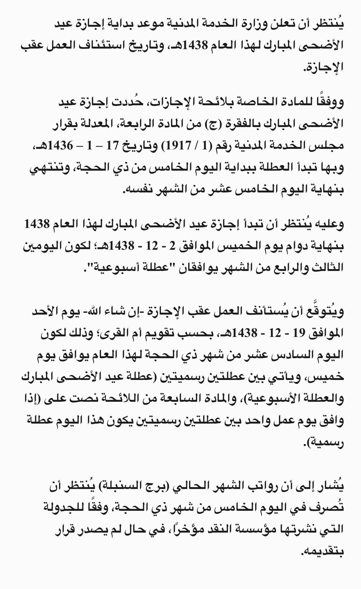 موعد اجازة الموظفين عيد الأضحى 1438 المرسال