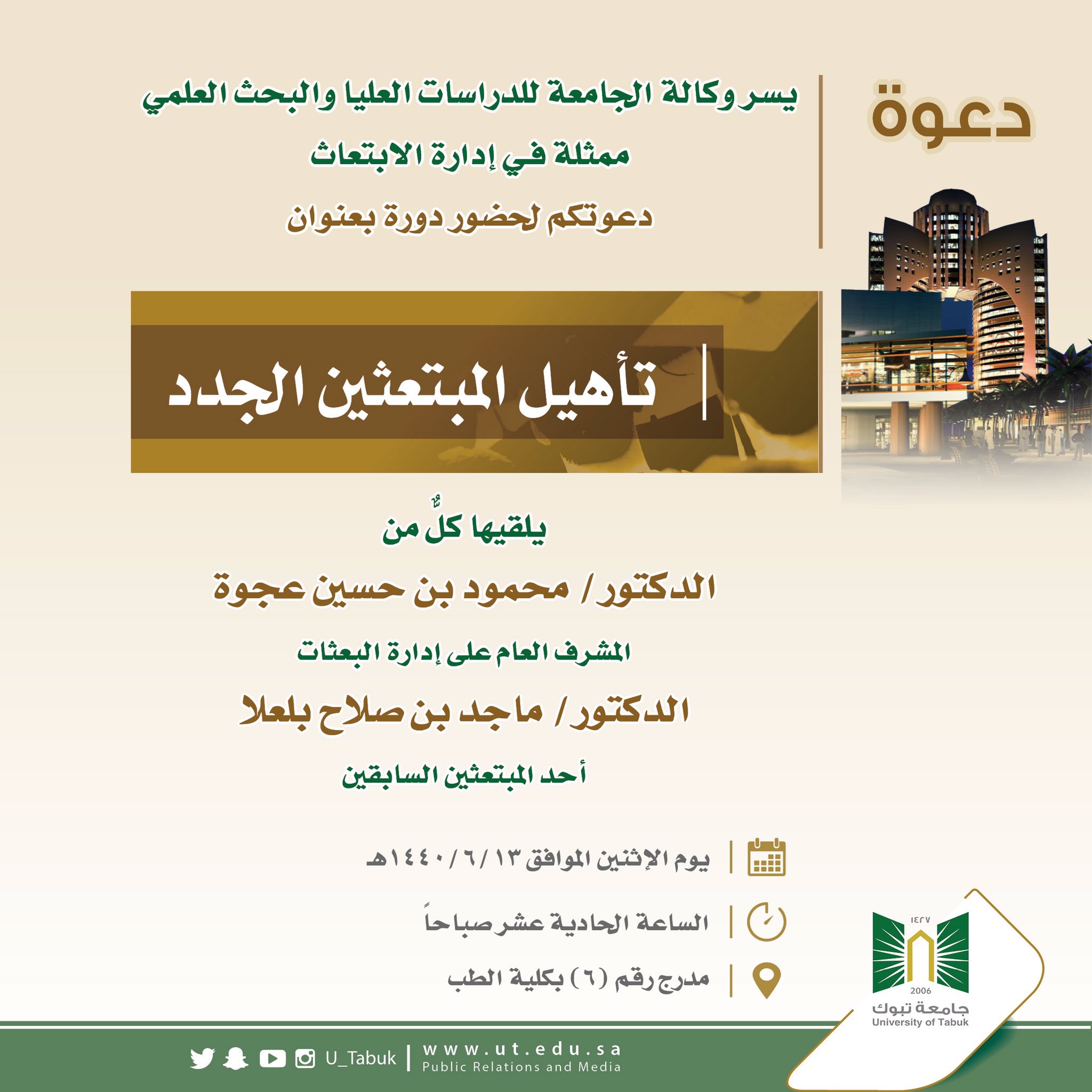 جامعة تبوك V Twitter دعوة يسر وكالة الجامعة للدراسات العليا والبحث العلمي ممثلة في إدارة البعثات دعوتكم لحضور دورة بعنوان تأهيل المبتعثين الجدد يوم الإثنين الموافق 13 6 1440هـ في تمام الساعة