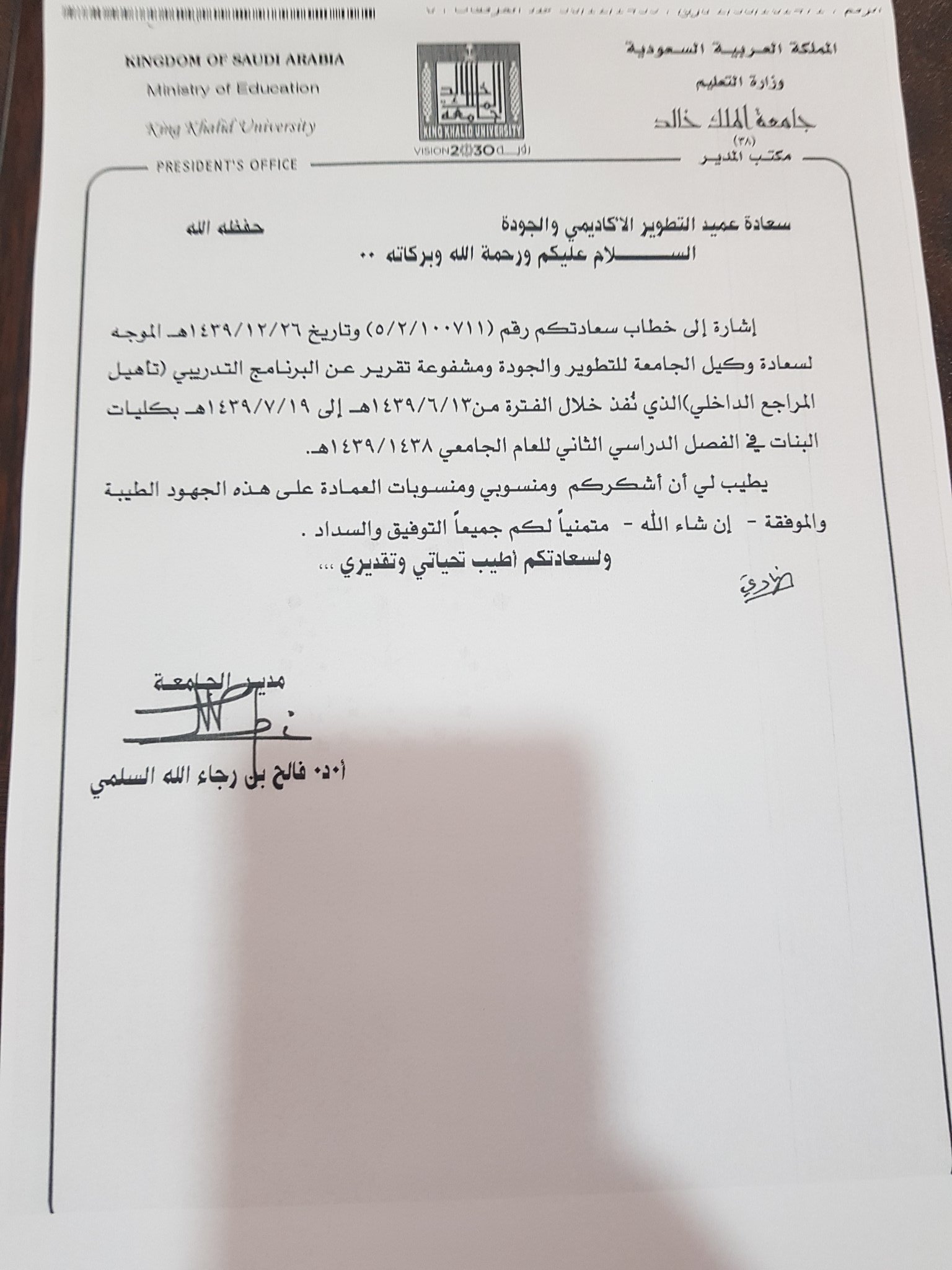 خطاب شكر من عمادة شؤون الطلاب لكلية التربية بشقراء جامعة شقراء